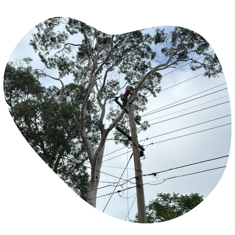 Tree pruning services in Australia with arborist trimming tall gum tree branches near power lines.